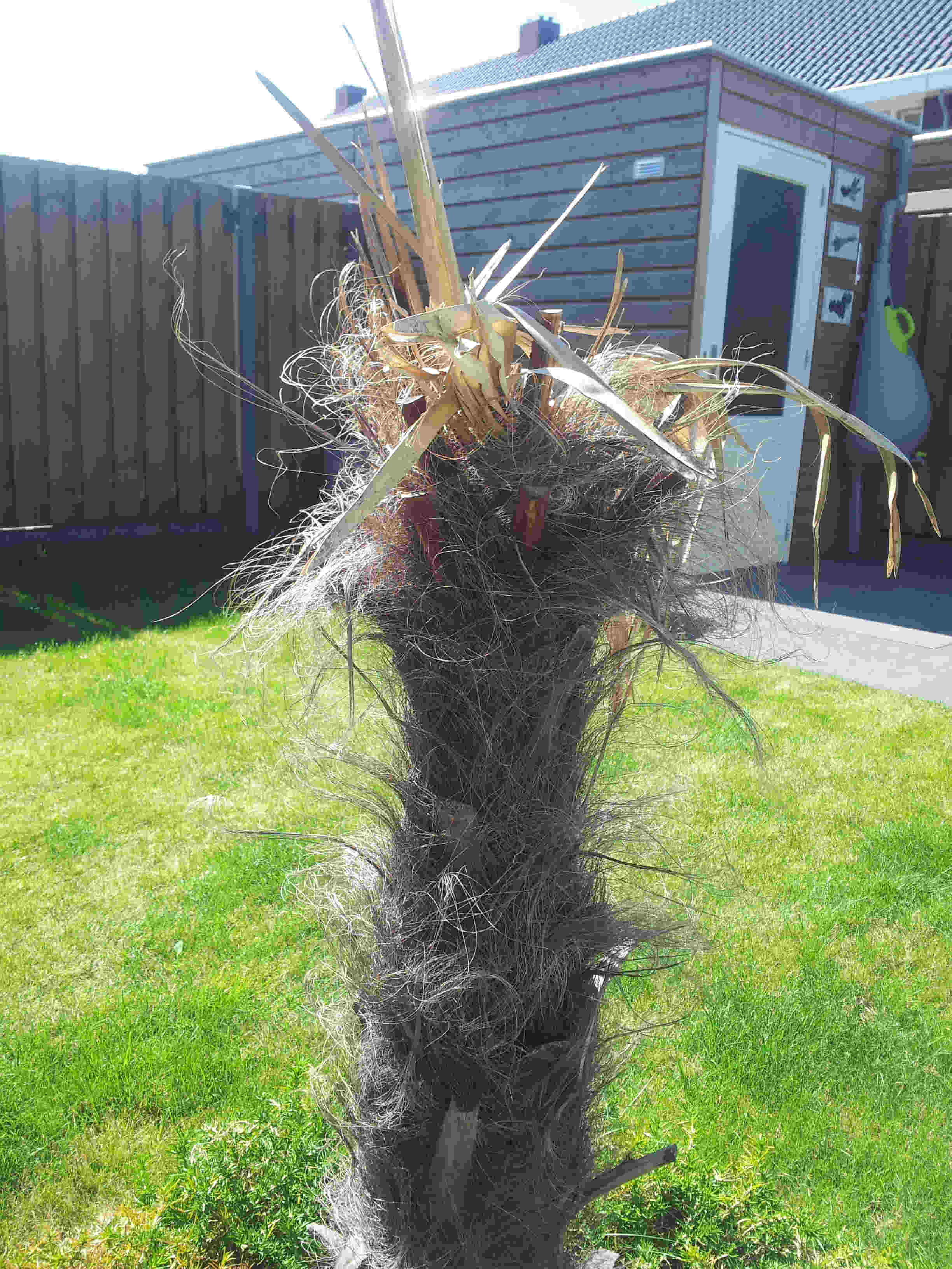 Hallo ik ben sinds april vorig jaar in het bezit van een trachy fortunei . deze 'staat in de volle grond en gaf tot afgelopen winter mooie bladeren . Na de heftige winter van vorig jaar werden de bladeren bruin en waren de mooie bladeren verdwenen . Ik heb de speer gevoeld en deze zat muur vast dus maakte ik mij geen zorgen. In het voorjaar heb ik koemestkorrels gestrooid en kalk vanwege de witte bladeren . Nu is het september en groeit de speer zeer langzaam en ontstaat er ook geen nieuw blad . De boom laat ook geen blad vallen met ik zie de stam wel groeien . Nu de speer wat opkomt wordt deze ook al wit /bruinig .dus geen enkel groen blad tot nu toe . Ik wil graag weten of iemand aan deze foto's of omschrijving kan zien wat ik zou kunnen doen om hemm niet af te schrijven want dat zou heel zuur zijn .