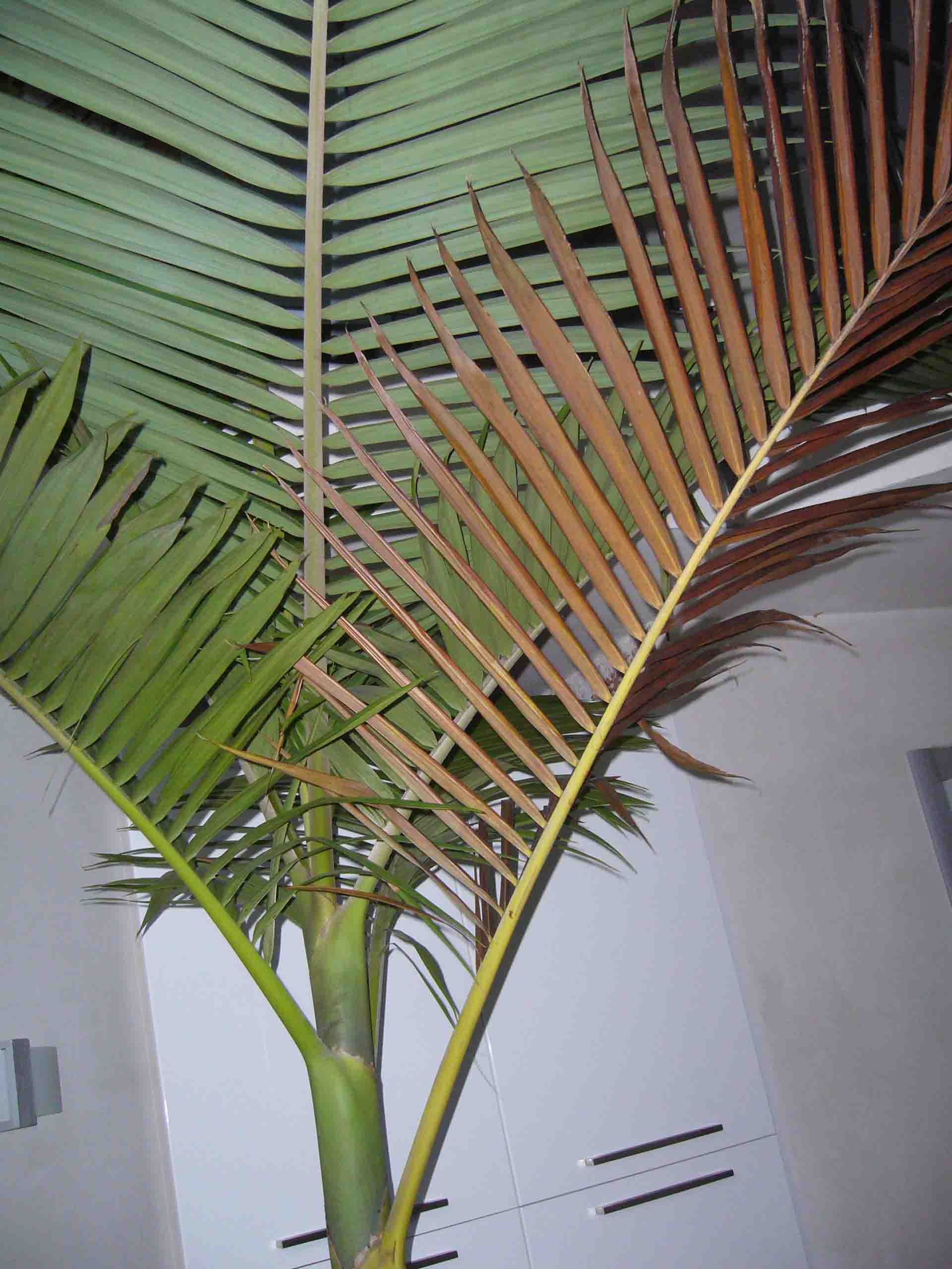toen vertoonde hij geen verbrandde bladeren, maar die delen vd palm die blootgesteld waren aan middagzomerzon zijn nu tijdens winter wel bruin geworden.
