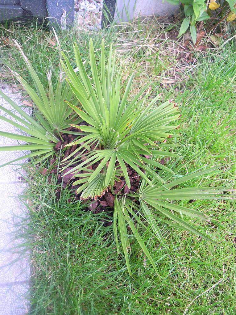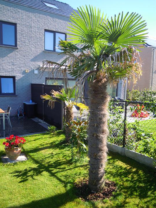 De Fortunei geplant in April is met veel liefde et een aangepaste grond reeds goed gegroeid. Ik heb er ook graszoden rond geplaatst om netjes af te werken. Even netelmest gemaakt (1 kg netels, 10 liter water, 10 dagen wachten). Dit geeft de palmen maar ook alle andere planten/bomen een mooie groene kleur en beschermt tegen ziektes. Op de voorgrond de olijfboom die volledig is hersteld na 100% bladverlies.