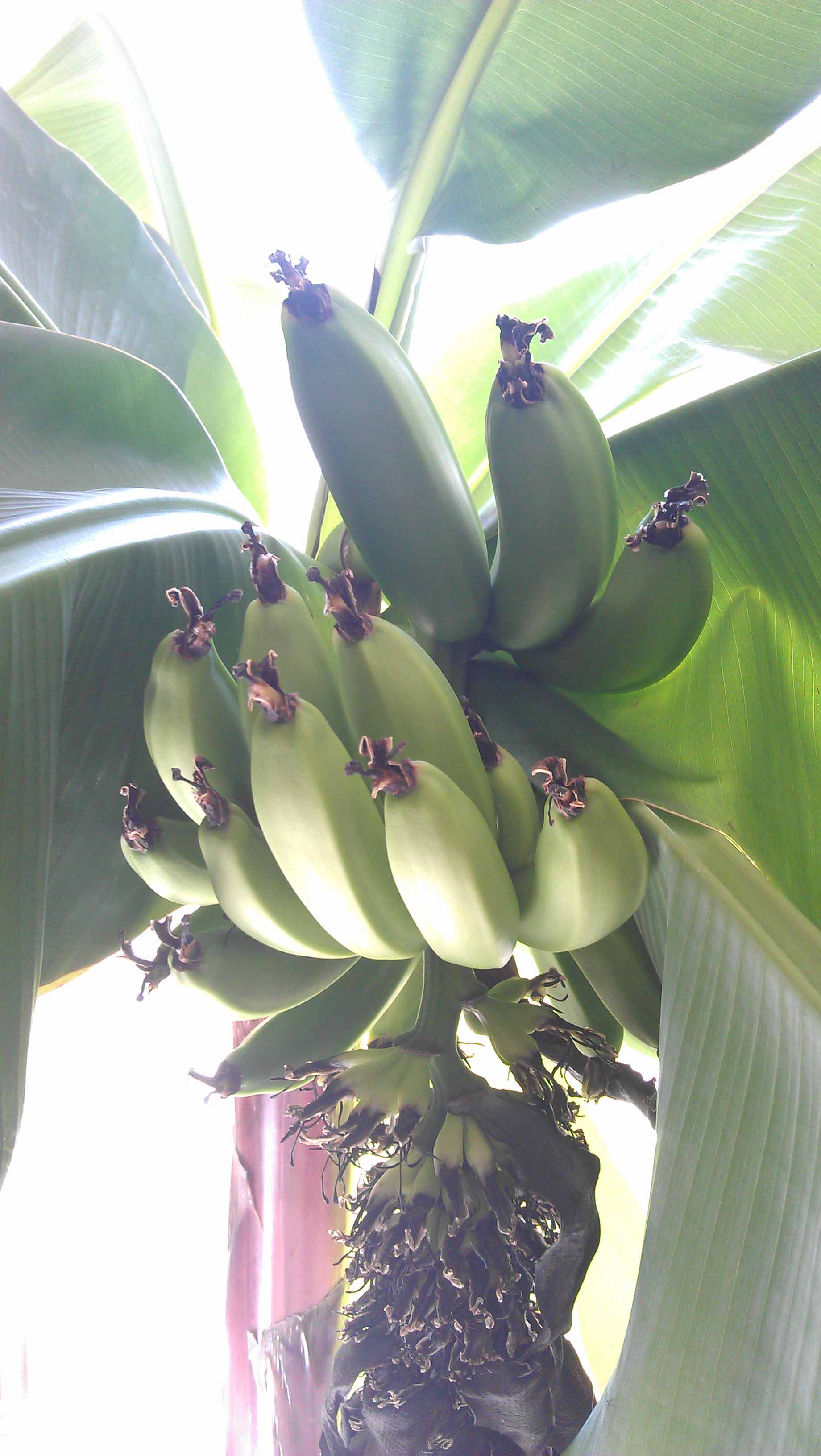 Ik vraag me af wat ik met de bananen moet doen; laten groeien tot ze afvallen (?) of ze op tijd aftrekken zodat de volgende rij banaantjes groter kan worden? Geen idee, maar ze blijven in ieder geval groen en krijgen volgens mij nog niet echt het steeltje dat je in de supermarkt ziet ;)