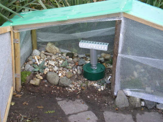 Dit kasje kan dicht en bij toenemende vorst gaat de petroleumkachel aan welke 3/4 dagen op één tankje kan branden, geeft niet heel veel warmte maar hopelijk net genoeg.