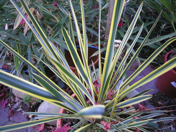 Wat mij over de bontbladige yucca's bekend is heb ik opgesomd op 21 oktober. Ik heb verder nog een witbonte vermoedelijke gloriosa met een purperen gloed waarvan ik de benaming niet weet. Zelf vind ik de Yucca filifera 'Bright Edge' erg fraai met de smalle bladeren. Het uit Italië (?) geïmporteerde exemplaar was pittig geprijsd, maar in het najaar lukt het vaak wel om korting te bedingen.