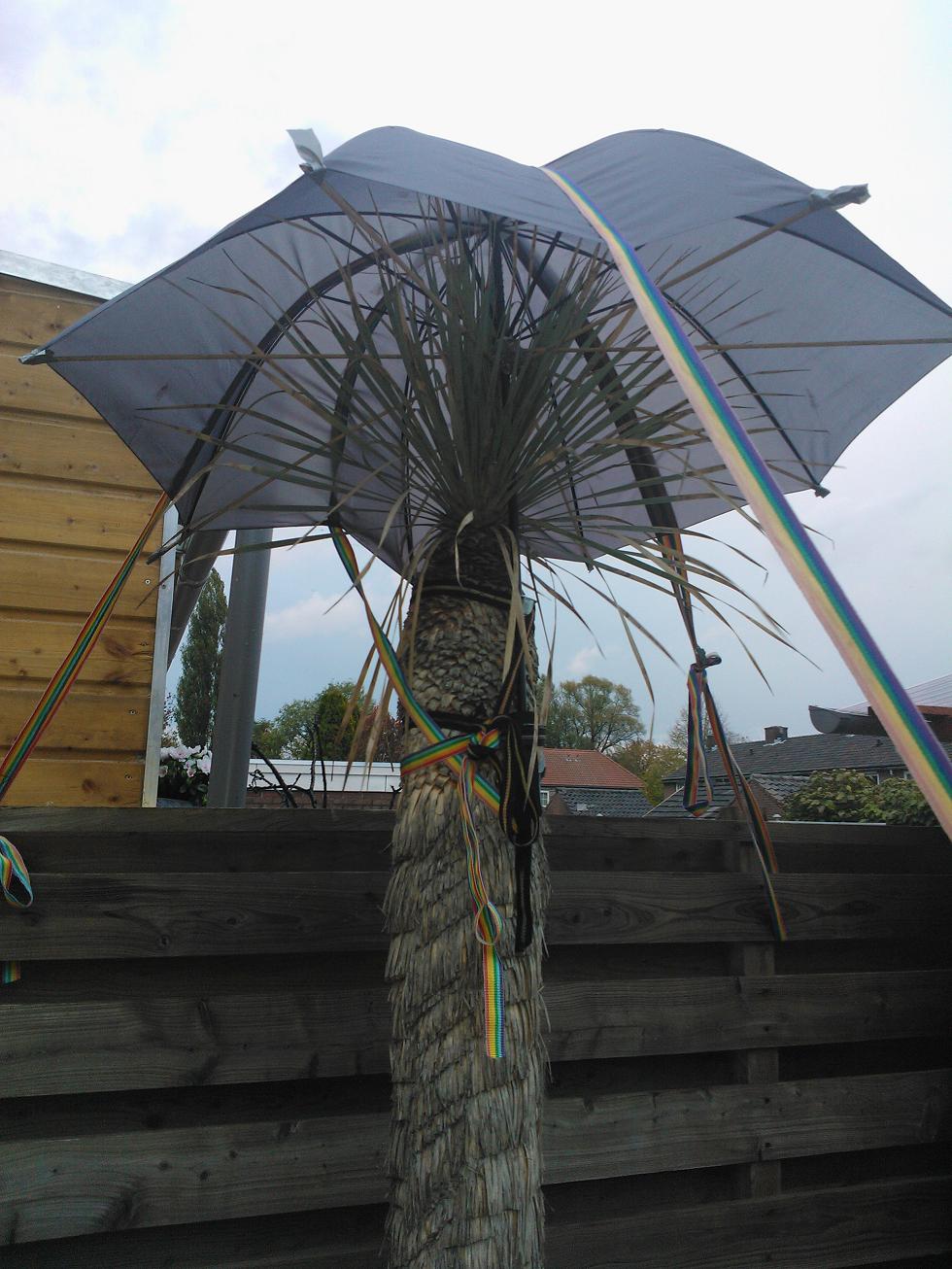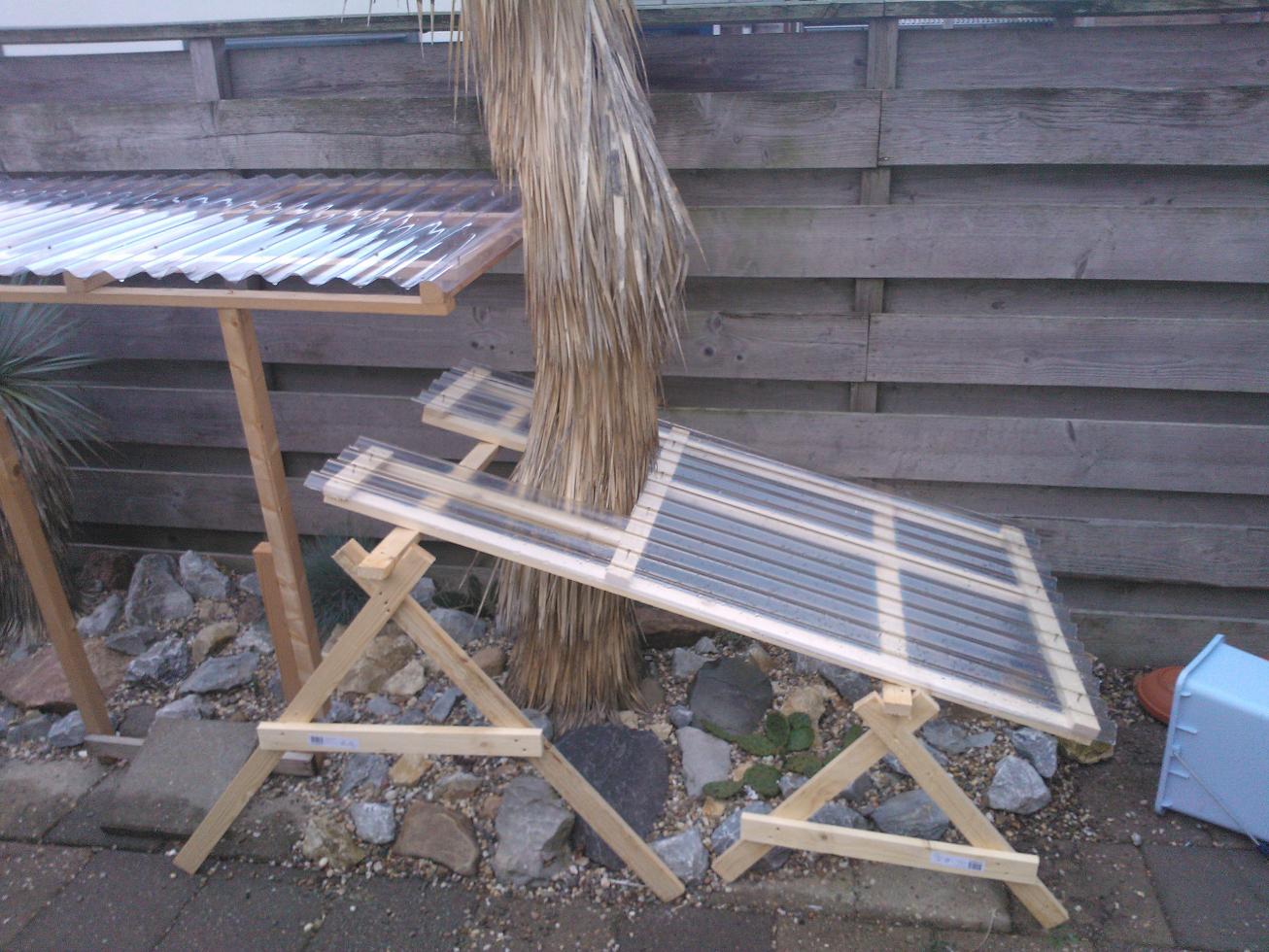 had al ongeveer 10 meter afdak langs de schutting en aan 1 kant een schuin deeltje, recent aan de andere kant ook zo'n schuin deel gemaakt. idee is simpel maar wel doeltreffend, kan het tevens makkelijk wegpakken en volgend jaar zo herbruiken. steekt onder het vlakke afdak wat tegen de yucca stam aan staat dus er zal zeer weinig vocht tussendoor gaan tevens geen vocht tegen de stam aan lopen vanwege die uitsparing.