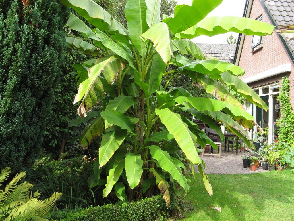 Niet gestoord door enige kennis zijn we begonnen dit in te richten; een van de eerste aankopen was een amendelboom die nog steeds ieder jaar bloeit,. Jammer genoeg weet het type niet want niet alle soorten schijnen eetbaar te zijn. Het tuinvirus kreeg me flink te pakken dus in de banm van kuipplanten ook een kas gebouwd. Toen ik zo'n 10 jaar geleden de eerste basjoos op de kop tikte heb ik een demontabele kas gemaakt; bananen in de volle grond swinters kas eromheen. Helaas moest de kas 10 jaar geleden wijken voor een aanbouw. Mijn 2 pollen basjoos verpak in een jas van noppenfolie met een verwarmingskabeltje erbij. Het kleine palmpje wat ik zo'n 20 jaar geleden kocht was een trachycarpus fortunei en staat in een pot gemaakt van planken tegen een speciekuip en is inmiddels een zware boom. In het midden van mijn tuin staat een liriodendron; een brachtige tulpenboom met geel/oramje tulpen en mooi blad. Enige nadeel is dat ie heel snel groeit dus om de 4 jaar 1/3 inkorten.. Dit jaar sloeg het plantenvirus weer hevig toe: pollen bamboe gekocht, een ceasalpinia gilliesi, een albizzio boubri, vijgenboom,gembers, een speciekuip met musa pink velutina, canna's, strelitzias en nog meer. Om dit te bergen flink ruimte in mijn kelder gemaakt. Mijn schuur heeft 2 transparante golfplaten en een paar weken gleden heb ik daaronder een soort telefooncel gemaakt met als dak een oude lichtkoepel. Een tweede lichtkoepel ligt inmiddels klaar...