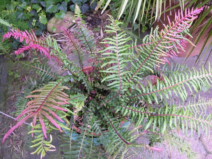 Ook al is de vraag van Hitch (Michael) inmiddels al opgelost, noem ik toch nog een paar andere rooduitlopende varensoorten zoals Woodwardia unigemmata, Blechnum wattsii en het geslacht Doodia waarvan met name D. australis (vermoedelijke soort) afkomstig uit Tasmanië (import Gardenpalms) bijzonder fel purperrood uitloopt. Of de laatste winterhard is heb ik nog niet uitgeprobeerd. Doodia media in de tuin heeft de afgelopen winter onder de sneeuwlaag overleefd.