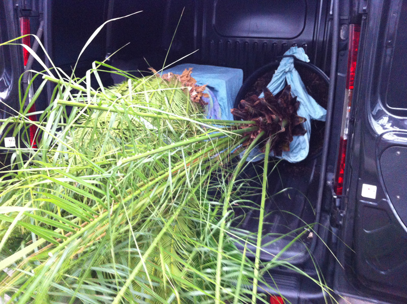 Zonde. Het exemplaar dat ik wel kon meenemen, heb ik eerst moeten kortwieken met de snoeischaar. De lange, uitgerekte bladstelen waren veel te lang (minstens 3 meter) om in mijn kleine bestelwagen te passen. Ik heb ze dan maar op ongeveer een meter lengte afgeknipt.