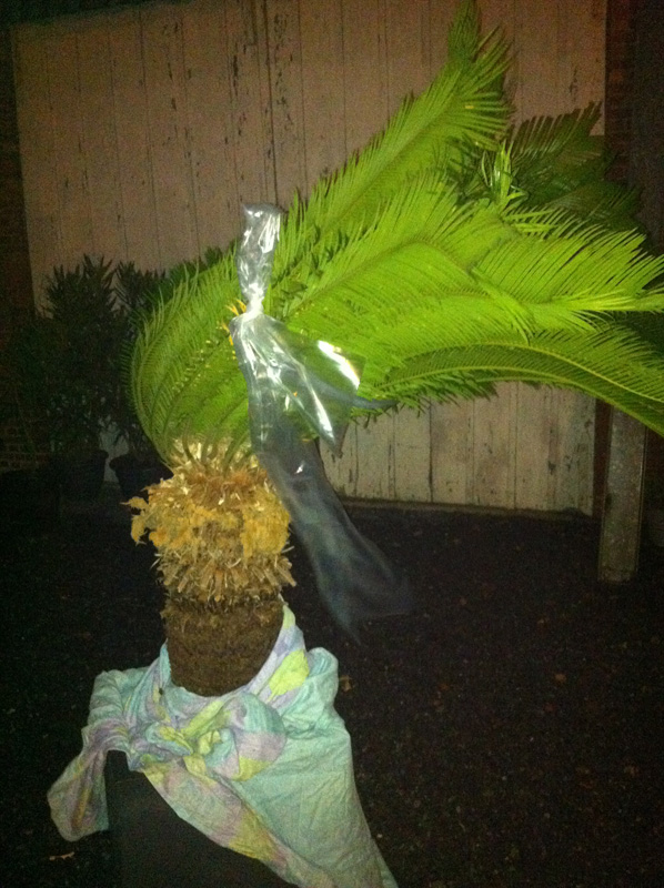 In de lente ga ik beide bomen planten in de tuin. Voorlopig staat de Cycas in mijn (onverwarmde) veranda. Zou het kwaad kunnen als ik de bladeren samenbind tot in het voorjaar? Want Mr Cycas neemt nogal veel ruimte in beslag.