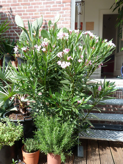 Ik heb sinds een paar jaar een Nerium oleander 'Atlas' en 'Villa Romaine'. Of deze soorten het predicaat 'winterhard' verdienen weet ik niet, maar het is me wel opgevallen dat de beide soorten geweldige bloeiers zijn, superhard groeien en toch in ieder geval flink vorstbestendig zijn. 's Winters staan ze hier onder dezelfde overkapping als mijn andere oleanders, en naast elkaar hebben de eerstgenoemde het steeds zonder een schrammetje overleefd en de 'gewone dubbelbloeiende' steeds met wat schade.