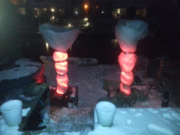 (tijdelijk)agavekasje met petroleumkacheltje temp. varieert van 0 tot +5, opzij ijspegels vanwege gesmolten sneeuw