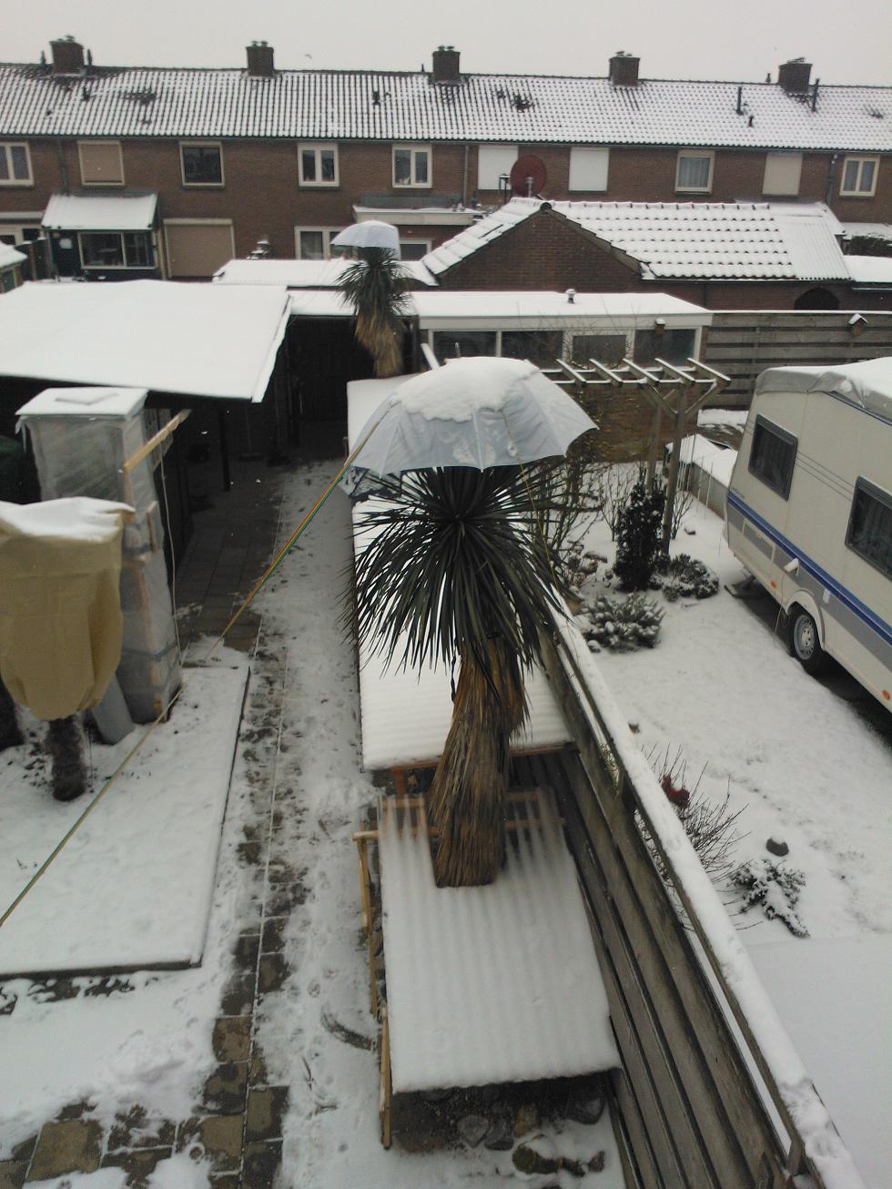 hier mijn hele rotsstrook overdekt, de grote rostrata's aan begin en eind een paraplu op de kop en een los afdakje over de kluit heen. de rostrata aan de andere kant van de tuin idemdito waarbij deze afdakjes tevens de cactussen aan de voet beschermen. midden in mn tuintje twee kleine palmpjes (fortunei) met een hokje van noppenfolie en twee grotere wagnerianussen in een zak met rits. de boomvaren in een hok met noppenfolie waarin een geraamte staat met een warmtekabel die m mooi vorstvrij houdt ;)