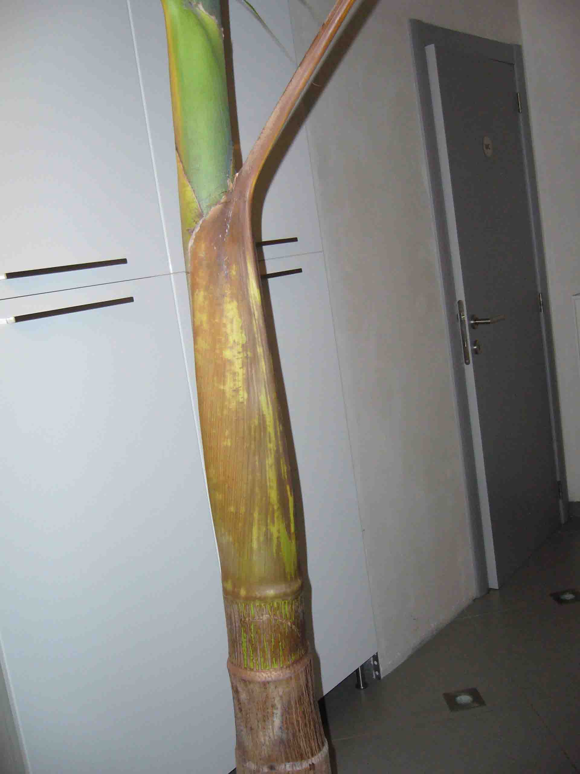 Hoi, ik heb er 2 gehad [ zaailingen] eentje heeft altijd binnen gestaan in de veranda die een gemiddelde temp. bedraagt van 21)C [in de zomer veel warmer] en daar ging dat exemplaar dan ook heel hard de andere heb ik het eerste jaar ook binnen gehad maar is in de lente die volgde bij wijze van experiment naar buiten gegaan wat ook goed te merken was een het groeiverschil, de grotere die binnen stond bleef blad produceren de kleinere buiten kwam niet verder dan 2 a 3 eind zomer, en die is de winter die volgde bij een kachel storing afgestorven het vroor toen -3ºc in de stalling, de grotere is naar de slaapkamer verhuist omdat die te snel groeide in de veranda , ik heb het nog 1,5 jaar kunnen volhouden in de hoge slaapkamer 3.40m maar ook daar ging het niet meer om dat de speren zich tegen het plafond stuk drukte, hij is naar een liefhebber gegaan, en is nu weer verder verhuist naar de tropische kas van Canna banana waar die nog even verder kan.