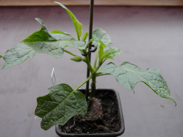 In de donkerste periode van deze winter probeerde ik een stek van de omgekeerde kruising (Sanguinea x Strybing Vulsa) te laten wortelen. Een stukje steel van 7 cm met een half blad wortelde en ging eind december groeien. Hier een foto van de stek na een maand: