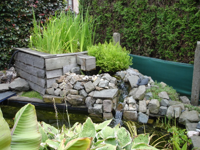 Ik zou hem zowiezo hoger zetten, anders krijg je problemen met de fysicawetten om het onderste water eruit te krijgen... want dat stroomt nog steeds niet omhoog :lol: De wet der communicerende vaten moet je in jouw voordeel laten werken... :mrgreen: