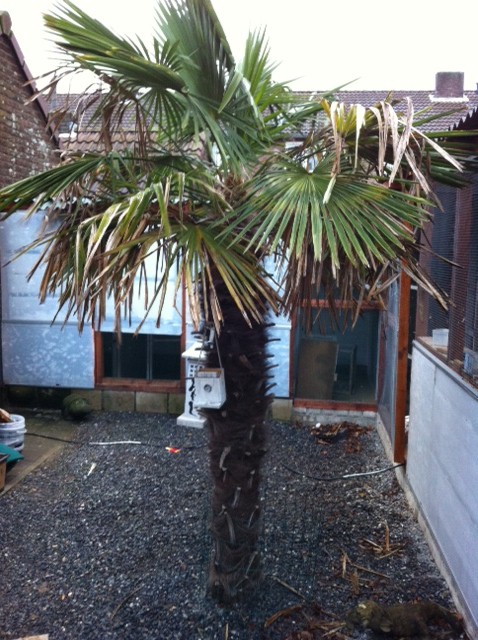 Nadat ik het voorschot betaald had, zei de verkoper plots dat de Trachy hier pas sinds november 2011 geplant staat. (Die volière rechts is staat er trouwens nog maar pas. Dat verklaart meteen de ongelukkige plaatsing van de boom.) Hij heeft de Trachy zelf al eens verhuisd toen hij in november 2011 in zijn huidige woning introk. In zijn vorige tuin stond hij ook in volle grond. In totaal heeft de verkoper de boom drie jaar. De trachy is dus anderhalf jaar geleden al eens verhuisd. Voordeel zal zijn dat hij daardoor misschien nog niet heel uitgestrekt geworteld is en hopelijk niet al te moeilijk uit te graven zal zijn, nadeel is dan wel dat de boom nu misschien een ferme klap zal krijgen doordat hij recent al eens verplaatst is geweest. Moet ik volgens jullie problemen verwachten als ik hem in maart ga halen en in mijn tuin plant?