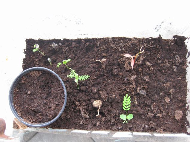 bovenaanzicht van mijn zaaibakje met albizia ,trachy en lychee