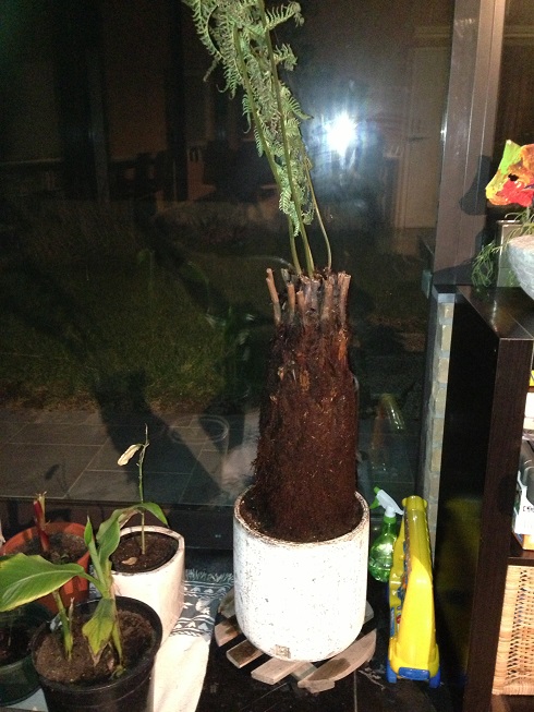 De kuip ziet eruit alsof die geen afwatering heeft wat nooit goed is omdat je nu niet kan zien of er water blijft staan op de bodem. Het is natuurlijk geen waterplant he en als de wortels (in jou geval dus de onderzijde van de stam) in stilstaand water water komt te staan volgt er sowieso rot en gaat je plant er aan. Beter is te werken met een onderschaal. Je mag je Dicksonia echt goed nat houden, kop, stam en potgrond maar het water MOET wegkunnen, dan kun je niet in de problemen komen. Zelf had ik trouwens toch een kuip genomen die wat groter is aangezien de kluit zijwaarts wortels vormt ter verankering maar veel groter hoeft dat nu nog niet te zijn.