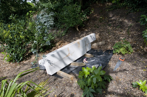 Het beeld is gemaakt van ytong gipsblokken, deze zijn verlijmt en de romp van het beeld is half rond gevijlt, de achterkant van het beeld is dus plat. Voor een geheel rond beeld van het formaat wat wij hebben gemaakt heb je nog veel meer gipsblokken nodig.