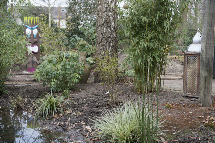 Bijna al het afgevallen blad van de beuken is geruimt en we hebben afgelopen weekend nieuwe bamboes gekocht en deze geplant. Ook een paar bamboes verplaatst. Zo krijgt ons houten pad ineens een heel andere uitstraling en heeft Ron me aangestoken met zijn houten tiki, dus ik ben ook een nieuw project gestart....