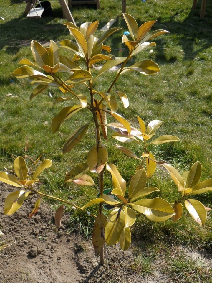 Mijn eerste winter een magnolia grandflora in volle grond. Exemplaar 1m50. Bladeren zijn wat gelig maar zonder bescherming overleefd. - 13,5 graden C. Open plek.