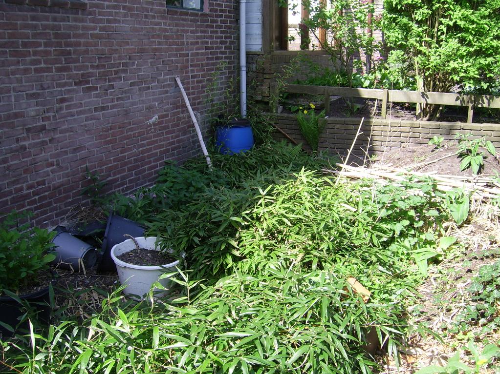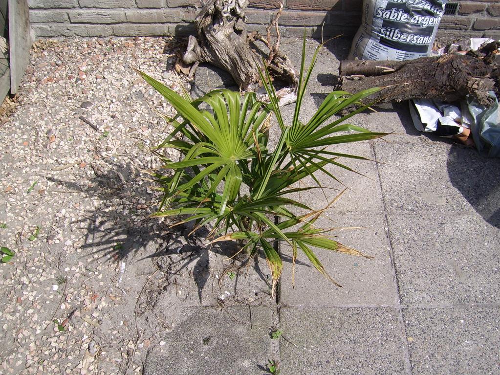Mijn eerste Trachycarpus fortunei heeft zijn eerste winter buiten overleefd. Mijn appel- en perenboompjes staan in bloei en 2 soorten aardbeien zijn geplant en lopen snel uit. Een deel van de kruiptijm is aangeplant rond de stapstenen.