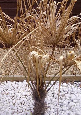Je kan controleren aan een palmboom of hij kapot is, door middel van aan de speer te trekken. Deze moet nog goed vast zitten. Je mag redelijk hard trekken hoor. Dus als je de nieuwste bladeren in het midden (groeipunt, waar de bladeren uitkomen) kan lostrekken, dan is je palmboom kapot ...