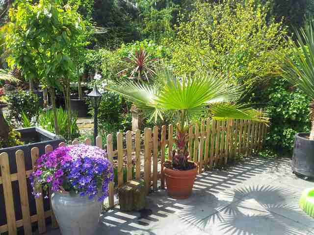 Het liefst zou ik dat willen, maar mijn tuintje is nogal klein. Als ik de palm in de volle grond zou zetten, komt -ie een stuk lager te staan en hangen de bladeren in je gezicht als je er langs wilt. Het zou vooral mijn vriendin nogal gaan ergeren als ze er niet meer langs kan zonder bladeren in haar gezicht te krijgen