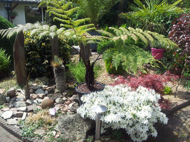 De palm zal dan waarschijnlijk wel flink aan het groeien gaan, want de -explosieve- groei blijft toch best achter. Ik zit nog op een manier te broeden dat ik de palm op een verhoogde manier toch in de volle grond kan zetten, zoiets als ik laatst met mijn Trachycarpus fortunei heb gedaan; daarvoor heb ik een gat in het beton van het terras gehakt, daar een bak ingezet waar ik de bodem uit heb gehaald, zodat de boom -verhoogd- toch in de volle grond staat en lekker door kan groeien, zonder dat je er last van hebt.