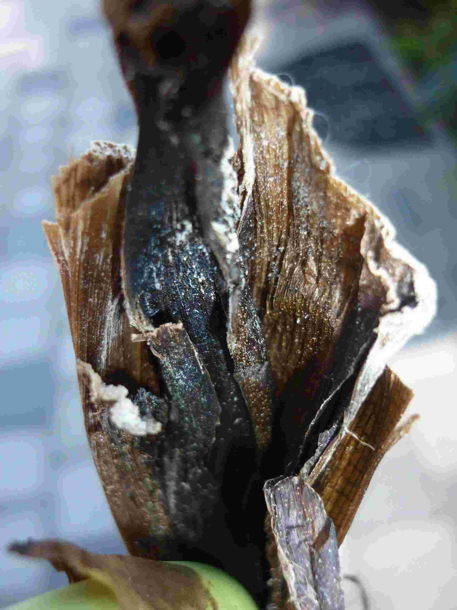 nu hebben we gemerkt dat de stam bruin word en een witte stip tevoorschijn komt ook stinkt het als je er aan gaat ruiken