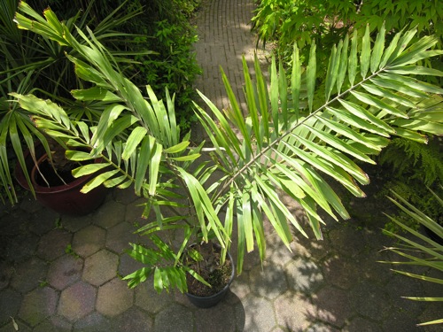 De Arenga heb ik verpot evenals de Phoenix, voor de laatste had ik de grootst beschikbare kuip nodig omdat onderaan de kluit een dikke kluwen vitale wortels zat, die de palm omhoog drukte. De overige aanwinsten kregen een topping organische bemesting. Phoenix theophrasti had ik nog niet eerder van nabij gezien. Het blad is een beetje grijsgroen van tint dat mooi contrasteert met de gele bladsteel. Het geeft deze stijve palm een aparte uitstraling, die bijvoorbeeld duidelijk verschilt van de forsere dactylifera. Dit is de laatste soort in het rijtje Phoenix palmen welke ik in de loop der jaren heb uitgeprobeerd, reclinata, dactylifera, sylvestris, rupicola naast de overbekende canariensis en roebelenii. Een bijkomstigheid hierbij is dat de Phoenix soorten vrij makkelijk hybridiseren. Daar waar een soort endemisch is zoals Phoenix canariensis op de Canarische eilanden, geeft dat problemen met het behoud van de inheemse soort als gevolg van de import van andere Phoenix soorten.