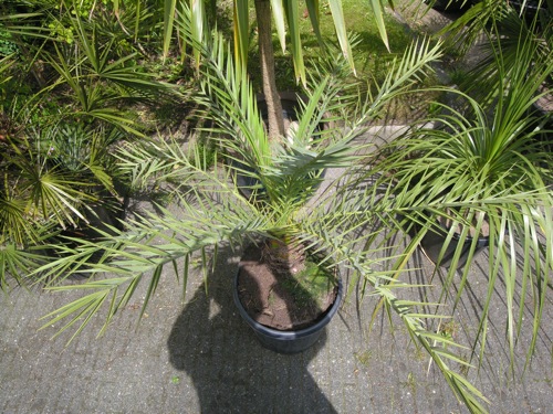 De Arenga heb ik verpot evenals de Phoenix, voor de laatste had ik de grootst beschikbare kuip nodig omdat onderaan de kluit een dikke kluwen vitale wortels zat, die de palm omhoog drukte. De overige aanwinsten kregen een topping organische bemesting. Phoenix theophrasti had ik nog niet eerder van nabij gezien. Het blad is een beetje grijsgroen van tint dat mooi contrasteert met de gele bladsteel. Het geeft deze stijve palm een aparte uitstraling, die bijvoorbeeld duidelijk verschilt van de forsere dactylifera. Dit is de laatste soort in het rijtje Phoenix palmen welke ik in de loop der jaren heb uitgeprobeerd, reclinata, dactylifera, sylvestris, rupicola naast de overbekende canariensis en roebelenii. Een bijkomstigheid hierbij is dat de Phoenix soorten vrij makkelijk hybridiseren. Daar waar een soort endemisch is zoals Phoenix canariensis op de Canarische eilanden, geeft dat problemen met het behoud van de inheemse soort als gevolg van de import van andere Phoenix soorten.