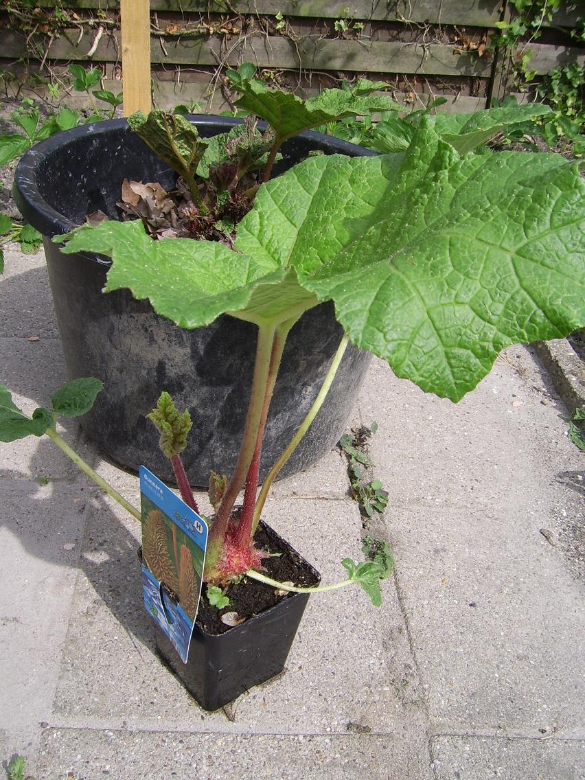 Nieuwe Gunnera vooraan en in speciekuip de oude