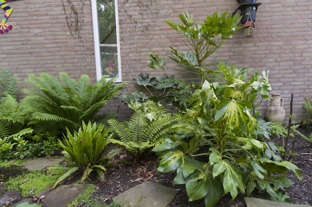 Muurleeuwenbek, Fatsia 'Spiders Web', Hosta's (althans wat er van over is :fluiten: ) en Fraaie vrouwenmantel.