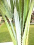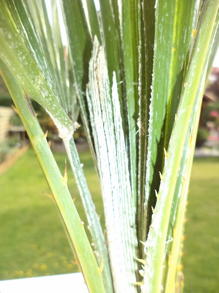 Eén palm heeft allemaal witte stipjes op zijn nieuwe bladeren. Ook de speer is volledig wit, is deze ziek? Indien ja kan ik hem nog terugbrengen...