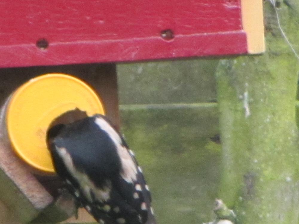 Ook hier de Grote Bonte Specht in de tuin. Altijd leuk en echt de baas op de feeders! Geen enkele Kool- of Pimpelmees durft dan nog op de pindafeeder te komen. :D