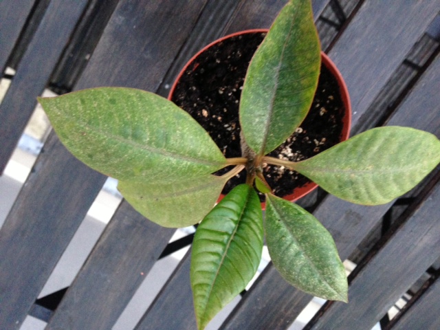 Ik probeer dit jaar mijn 4 plumeria stekjes op te groeien, nadat ik deze vorig jaar laat in het seizoen had weten te ontkiemen. Drie van de vier stekjes hebben al wat bladeren gevormd. De bladeren beginnen steeds mooi glimmend en diep groen maar worden spoedig wat grauwer en vormen zich spikkels. Dit is op de foto goed te zien (het blad dat naar beneden wijst is nieuw).