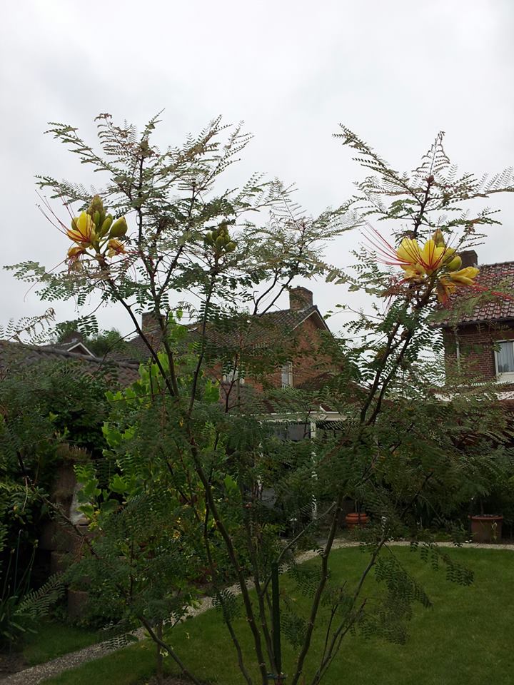 Ik heb de Caesalpinia gilliesii in bloei die heeft tot half april in de kas gestaan. Ook heb ik er ene in de volle grond staan en deze was van de winter alleen beschermd met een bigbag zak. Deze was wel in gevroren maar heeft nu ook bloem knoppen.