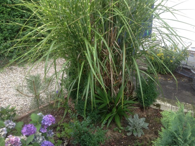 Het riet is Miscanthus sinensis "zebrinus", die kan je best om de 5tal jaar eens uitdoen en een stuk ervan terugplanten, want de wortelkluit wordt stilletjes groter, en de pol wordt op de duur kaal in het midden waardoor de bos in het najaar snel uiteen waait. Verder een makkelijke en mooie plant vind ik.