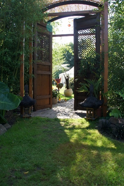 Heel jungle-achtig en tegelijk ook heel oosters. Hou van je gebruik van bamboe als reling of schutting. Die bruine deuren vind ik ook geweldig staan. Heel sfeervol allemaal hoor, verder mooie grote planten en palmen !