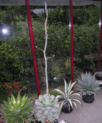 Deze Agave (leeftijd onbekend) was nog mooier toen ik 'm kocht, maar afgelopen winter ontstonden er zwarte vlekken in de bladeren. Door de plant iets warmer en droger te zetten, heb ik dit process kunnen stoppen. Mijn succulenten overwinteren in de koude kas waar tegelijk een hoge luchtvochtigheid heerst. Deze potatorum kan daar blijkbaar slecht tegen. Ik heb inmiddels wel een vervanger voor dit exemplaar bij gebrek aan zijloten. Ik neem tenminste aan dat de solitaire bloemen aan de onderzijde niet te stekken zijn.