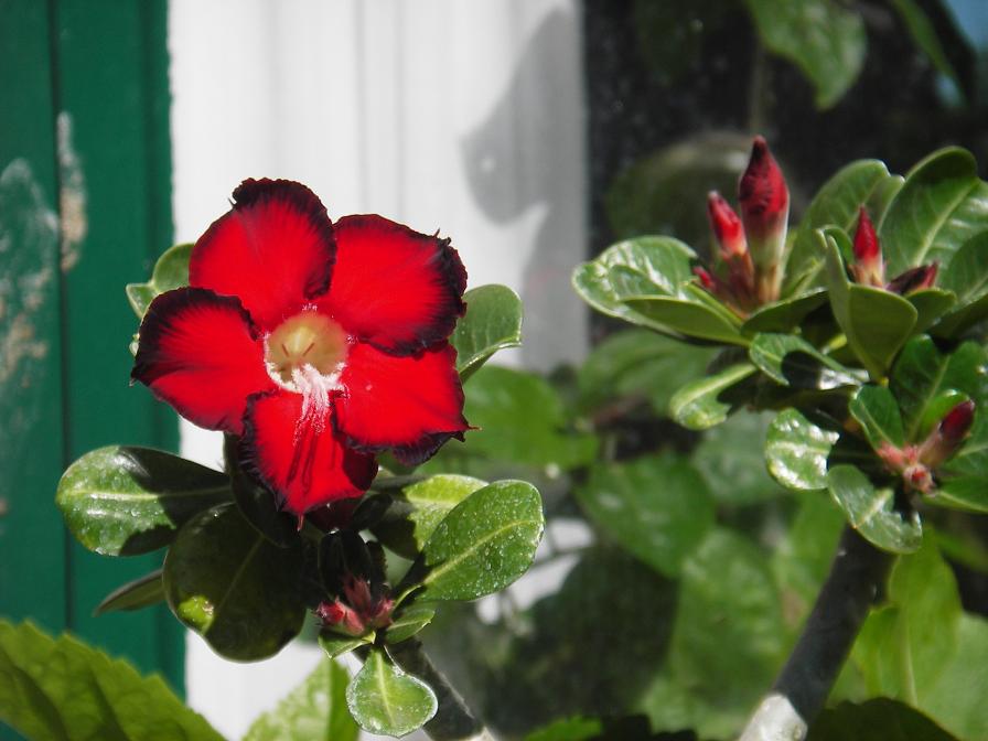 De Adenium heb ik een jaar of 4of 5 geleden gezaaid. Vorig jaar ook knopvorming gehad maar dat heeft niet doorgezet tot bloei. Dit jaar zit hij vol met knoppen en deze contastvolle bloei.