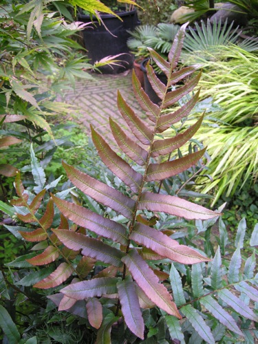 Het geslacht Blechnum kent verschillende soorten met aantrekkelijk rooduitlopend blad. Maar ook van andere genera bestaan fraai getinte soorten al dan niet met een bijzondere tekening. Humata tyermanii loopt dieprood uit evenals de Woodwardia's unigemmata en orientalis. Ook Athyrium kent een aantal kleurige variëteiten zoals niponicum "Pictum' en otophorum 'Okanum'. Vanwege de gevoeligheid voor slakken houd ik deze selecties aan als kuipplant. Een experiment met Arachnoides simplicior in de tuin faalde eveneens.