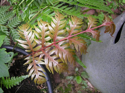 Het geslacht Blechnum kent verschillende soorten met aantrekkelijk rooduitlopend blad. Maar ook van andere genera bestaan fraai getinte soorten al dan niet met een bijzondere tekening. Humata tyermanii loopt dieprood uit evenals de Woodwardia's unigemmata en orientalis. Ook Athyrium kent een aantal kleurige variëteiten zoals niponicum "Pictum' en otophorum 'Okanum'. Vanwege de gevoeligheid voor slakken houd ik deze selecties aan als kuipplant. Een experiment met Arachnoides simplicior in de tuin faalde eveneens.