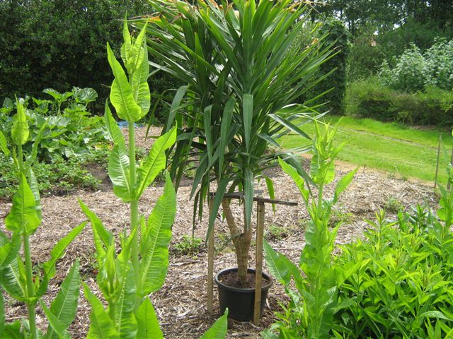 Ik heb een Yucca elephantipes in de serre in de volle grond staan,en die reikte tot het dak(de bovenste bladeren zijn zelf al verbrand) en moest er een stuk afzagen.Ik wilde deze maar hakselen en op de komposthoop doen,maar dacht bij mij zelf, als ik deze eens in een pot zetten, wie weet maakt deze geen wortels,dus nu heb ik een stekje van bijna 2meter hoog.