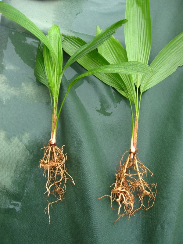 Heb enkele Licuala's. Links op de foto een Licuala Cordata en rechts een Licuala Grandis. De Cordata vouwt zijn bladeren mooi open in een waaiervorm maar bij de Grandis blijven die wat geplooid zitten. Is dit normaal of krijgen ze als kleine plant teveel licht. Staan onder een Velux op het Zuid-oost. Heb ze beiden gekocht als zaailingen, een drietal jaar geleden.