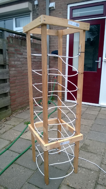Ik heb twee hokjes gemaakt, 1 met de kabel tussen twee panlatten in voor de boomvaren en 1 met de kabel aan de binnenkant van de panlat voor de cycas. Boomvaren heeft 24 meter en 300 watt met thermostaat geschakeld, cycas 12 meter en 150 watt idem.