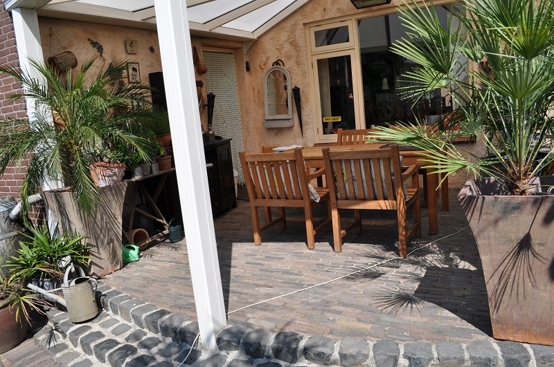 Onder deze overkapping kunnen we in het vroege voorjaar al lekker buiten zitten daar deze op het zuiden ligt. In de warme zomerdagen is het hier weer te warm om te eten en verhuizen we naar de tweede overkapping die ook mediteriaans aan doet.