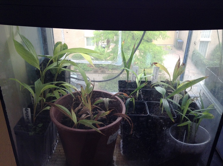 Het licht in die bak is 24 uur aan, en er staat meestal een laagje water in de bak van 0.5-1 cm. Ik heb gemerkt dat ook bananen er als gekken in kiemen, en andere echt tropische soorten zoals bijvoorbeeld Calyptrocalyx, Heterospathe, Geonoma, Aiphanes en Igunaura er prachtig uitzien door de enorme vochtigeheid.