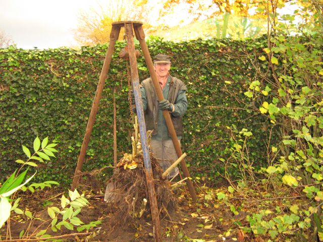 gezien het formaat en het besparen van zoveel mogelijk wortels zal ik hem na het losspitten uit de tuin moeten takelen, kan de stam het gewicht houden of zal hij breken/scheuren? ik verwacht een kluit van 100L /150L te krijgen