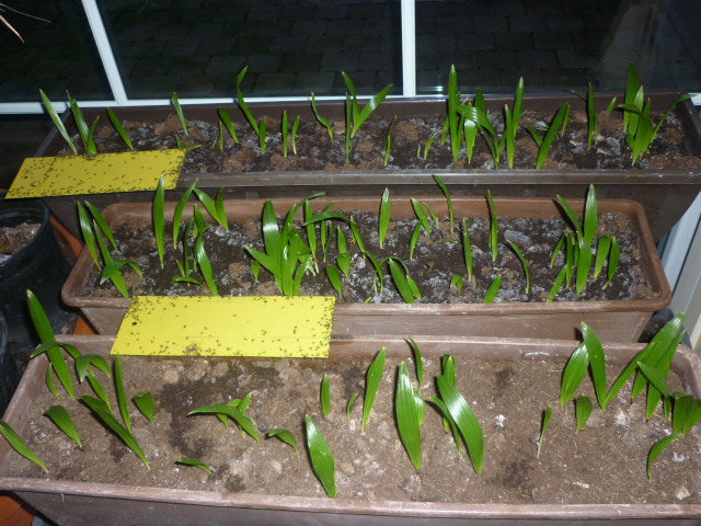 hallo ;maar goed dat ik ze heb binnen geplaatst er is al flink wat opkomst te zien van trachy zaailingen .om welke soort trachy het gaat weet ik niet ze werden per tros (1080 zaden )verkocht als decoratie materiaal voor maar 7.50. de mevrouw van de bloemenwinkel zei dat het van een dadelpalm was ik denk dat ze veel geld waard zullen zijn ;de eerste trachys met dadels