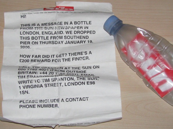 This is a message in a bottle from the Sun Newspaper in London, England. We dropped this bottle from southend pier on thursday january 19, 2006